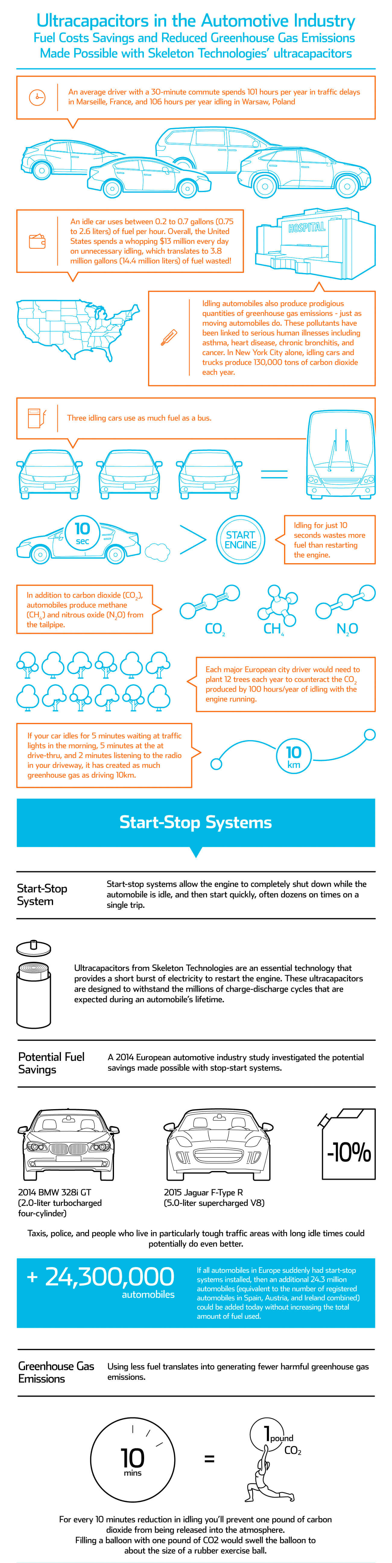 Start-stop systems allow the engine to completely shut down while the automobile is idle, and then start quickly, often dozens of times on a single trip. Ultracapacitors are the essential technology that can provide a short burst of power to restart the engine. Skeleton's ultracapacitors are designed to withstand the millions of charge-discharge cycles that are expected during a car's lifetime.