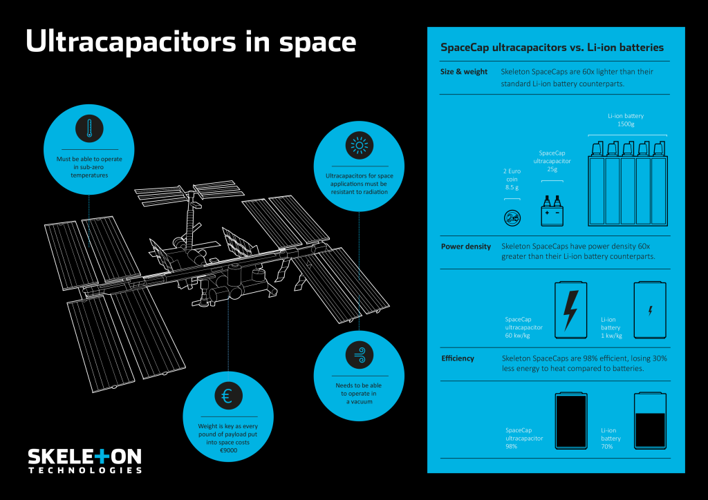 Ultracapacitors can charge almost instantly and deliver significantly more power for weight compared to batteries. Using ultracapacitors for tasks such as adjusting antennae and moving solar arrays will considerably reduce the amount of weight and room required for energy storage. With every pound of payload put into space currently costing around €9,000, adopting Skeleton Technologies’ ultracapacitors is expected to achieve significant efficiency savings for the European Space Agency.